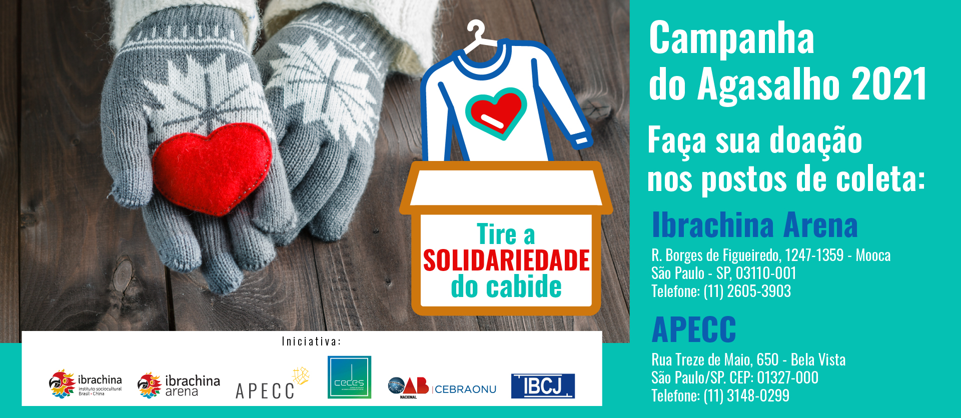 Pensando nisso, a APECC em conjunto com o Instituto Sociocultural Brasil China (Ibrachina), Ibrachina Arena, Instituto Brasileiro de Ciências Jurídicas (IBCJ), Centro de Estudos de Direito Econômico e Social (CEDES) e Comissão Especial Brasil/ONU (CEBRAONU) lançaram a Campanha do Agasalho 2021 - Tire a Solidariedade do Armário. A coleta vai até 30 de julho nas sedes da APECC e do Ibrachina Arena.