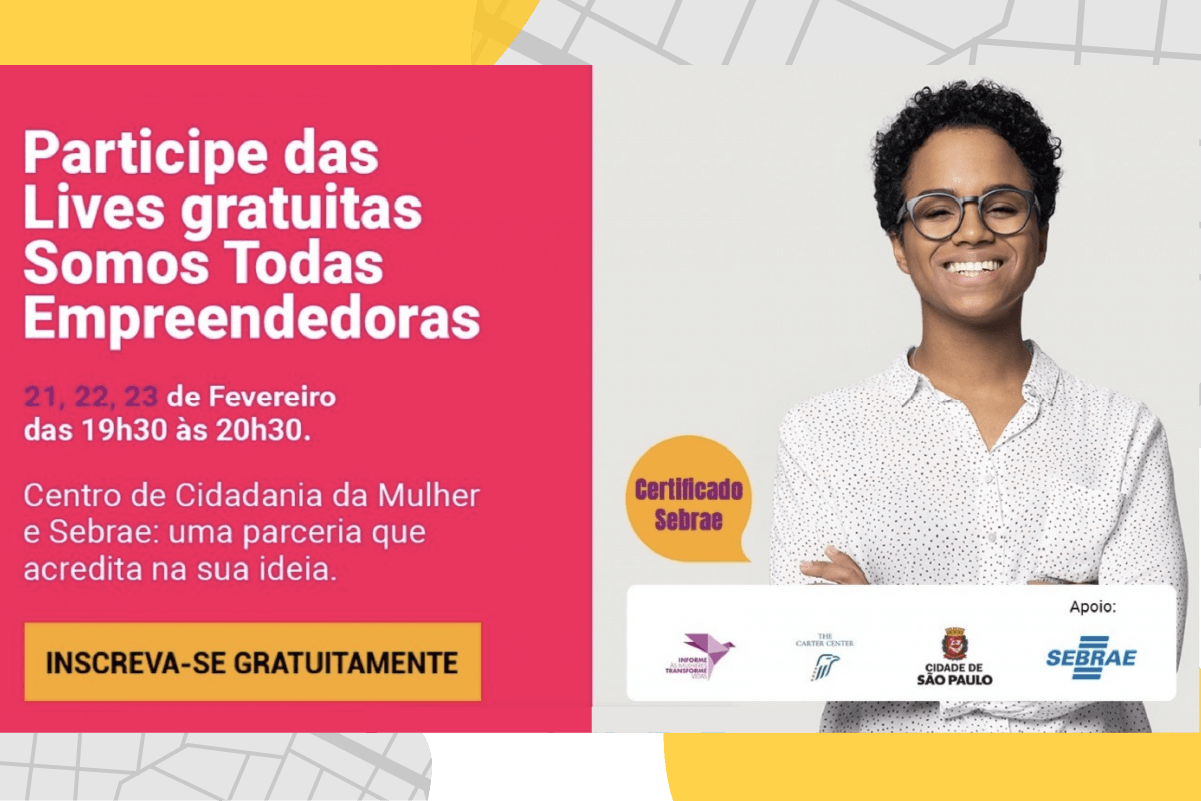 A Prefeitura de São Paulo e o Sebrae-SP realizarão entre os próximos dias 21 e 23, cursos gratuitos sobre empreendedorismo para mulheres. As participantes farão parte do programa Sebrae Delas, para que possam adquirir habilidades para alcançar a independência financeira. As transmissões serão realizadas pelo canal do Youtube da Secretaria Municipal de Relações Internacionais, das 19h30 às 20h30, e as participantes receberão certificado.