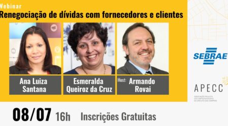 A APECC realiza no dia 08/07, às 16h, um webinar sobre renegociação de dívidas com fornecedores e clientes, com Ana Luiza Santana, especialista em Direito Tributário e do Trabalho, e Esmeralda Queiroz da Cruz, especialista em Administração de Recursos Humanos e Gestão do Ambiente de Trabalho pela Fundação Getúlio Vargas. Para participar, inscreva-se gratuitamente clicando […]