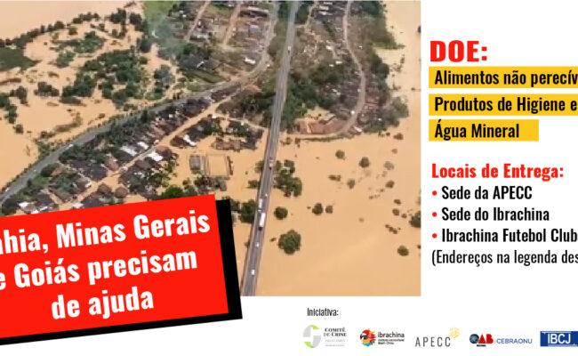 Com o foco de atendermos os desabrigados vítimas das inundações nos estados de Minas Gerais, Bahia, Espírito Santo e Goiás, APECC e Ibrachina se uniram no trabalho de arrecadação, buscas de parceiros e envio de mantimentos. Serão arrecadados alimentos não perecíveis, água mineral e cestas básicas, bem como produtos de higiene e limpeza, colchões e […]